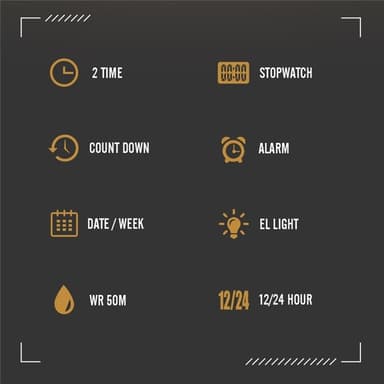 Funktioner: tid, stoppur, datum, timerlarm, veckovisare, EL-lysande, timvisare, 12/24-timmarssystem, nedräkning