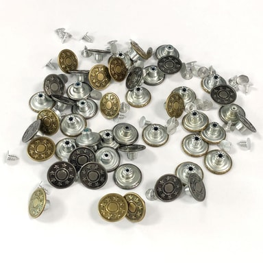 50 st kompletta satser med jeansknappar, tillverkade av högkvalitativt järn som är mycket slitstarkt. Innehåller två varianter i två olika färger, 25 st av varje, i en praktisk förvaringsask.