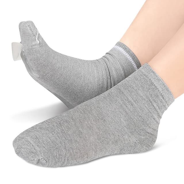 Tåinriktning: Korrigera och räta ut dina tår med dessa innovativa gel tåseparatorsockor. Den inbyggda tåseparatorn uppmuntrar försiktigt korrekt tåinriktning, förhindrar överlappande tår och minskar friktionen mellan tårna. Detta hjälper till att lindra tryckpunkter och obehag, vilket främjar en hälsosammare fotmekanik. Regelbunden användning av dessa strumpor kan förbättra tåavståndet och inriktningen, vilket minskar risken för hallux valgus och andra fotproblem. Det mjuka, flexibla materialet säkerställer en bekväm passform, medan tåseparatorn ger riktat stöd för optimal tåinriktning. Dessa strumpor är ett utmärkt val för individer som vill förbättra sin fothälsa och förebygga framtida fotproblem.