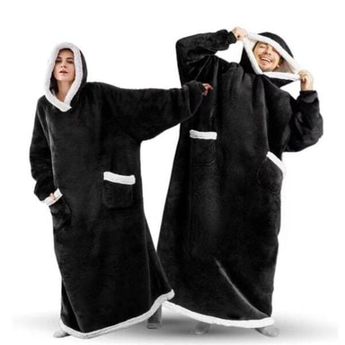 Denna långa oversized hoodie till vuxna kombinerar komforten av en stor mysig tröja med värmen av en filt. Tillverkad av mjukt fleece-material håller den dig varm och bekväm oavsett om du slappar hemma, är ute på stan eller tittar på en match. Hoodien är också mångsidig nog att användas som morgonrock, badrock eller en extra filt.