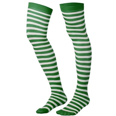 Iögonfallande, attraktiva och med en snygg passform: Ingen tvekan, de här grön- och vitrandiga overknee-strumporna drar alla blickar till sig! Det åtsittande materialet sätter benen i fokus. Det kontrasterande randiga mönstret ser fräckt och ungdomligt ut och passar perfekt till många förklädnader och tillfällen. Förutom det extravaganta utseendet är dessa ogenomskinliga damstrumpor i stay-ups-modell mycket bekväma att ha på sig; de har en perfekt passform och skyddar mot kylan. Material: 95 % polyester, 5 % elastan.