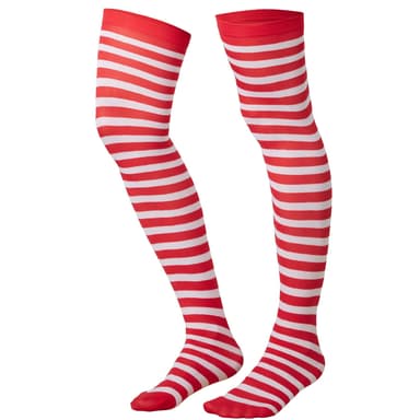 Iögonfallande, attraktiva och med en snygg passform: Ingen tvekan, de här röd- och vitrandiga overknee-strumporna drar alla blickar till sig! Det åtsittande materialet sätter benen i fokus. Det kontrasterande randiga mönstret ser fräckt och ungdomligt ut och passar perfekt till många förklädnader och tillfällen. Förutom det extravaganta utseendet är dessa ogenomskinliga damstrumpor i stay-ups-modell mycket bekväma att ha på sig; de har en perfekt passform och skyddar mot kylan. Material: 95 % polyester, 5 % elastan.