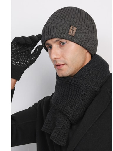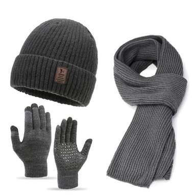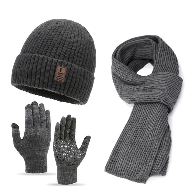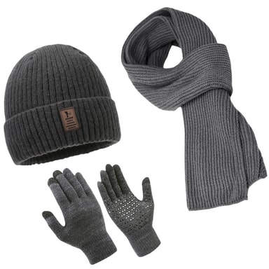 • Varm stickad 3-delad set för män: mössa, halsduk och handskar Grå
