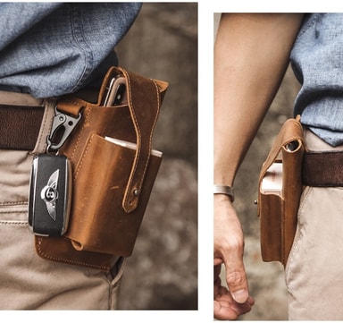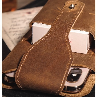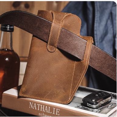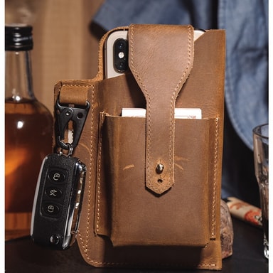 Telefonhölstret i läder ger snabb åtkomst till din telefon och glider enkelt in och ut. Den kan fästas säkert runt midjan och den enkla och snygga stilen kan bäras med alla byxor.
