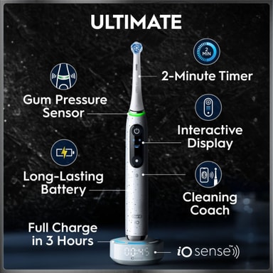 Oral-B iO10 elektrisk tandborste 067423 ger en personlig rengöring med iO Sense-putscoachen för vägledning i realtid. Den har även 7 putslägen och ett tryckkontrollsystem som säkerställer säker och effektiv tandborstning.Läs mer om produkten