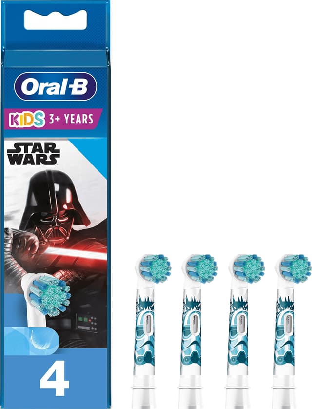 Oral B Kids Star Wars tandborsthuvuden 388197 gör dina barn glada inför morgonens och kvällens tandborstning med den färgstarka Star Warsdesignen. Huvudena har extra mjuka borstar och små runda huvuden för skonsam och effektiv vård. Det ingår 4 tandborsthuvuden i paketet.