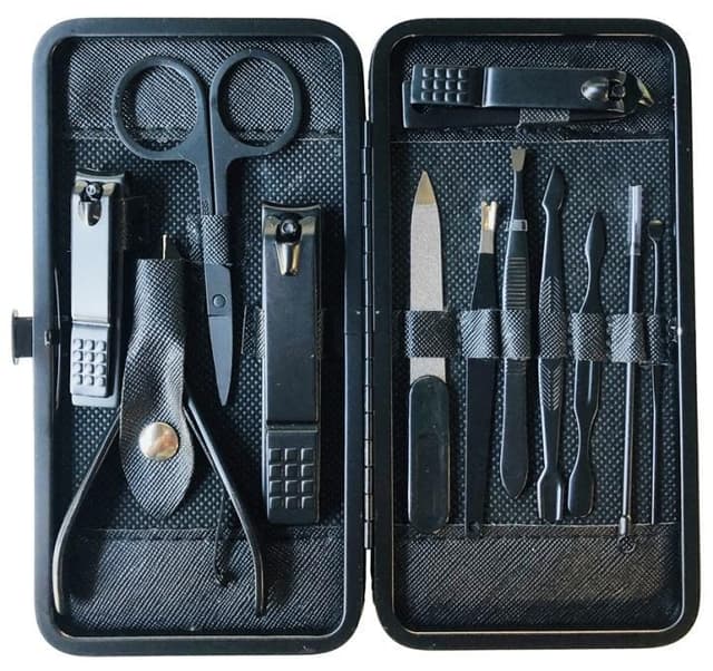 Nagelset i 13 delarSet för manikyr och pedikyr som kommer i en snygg och praktisk väska med snygga svara verktyg i stål. Alla verktyg som krävs för att hålla naglar och nagelband i fint skick.