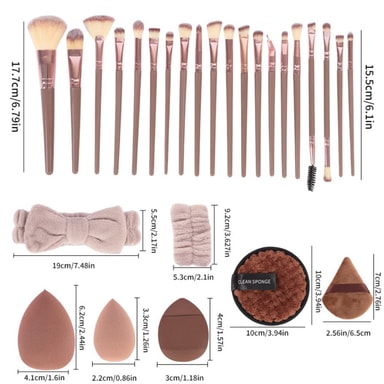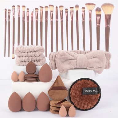 Komplett sminklösning: Detta 40-delars sminkborstset erbjuder en omfattande lösning för alla dina sminkbehov. Det inkluderar en mängd olika borstar för applicering av foundation, ögonskugga, rouge och mer. Setet innehåller också skönhetssvampar, ett hårband och handledsband, vilket säkerställer att du har allt du behöver för en felfri sminkapplikation. Perfekt för både nybörjare och professionella makeupartister, detta set låter dig skapa ett brett utbud av utseenden med lätthet och precision. De högkvalitativa nylon- och ABS-materialen säkerställer en bekväm och effektiv applicering varje gång. Detta set är idealiskt för daglig användning, resor eller som present.
