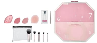 Real Techniques 12 Days Of Glow Advent Calendar 12 piece Cleansing Sponge/Complexion Sponge/Travel Sponge Cage/Mask Applicator/5 Brushes/Brush Cleanser Gel/Tweezers/Pouch