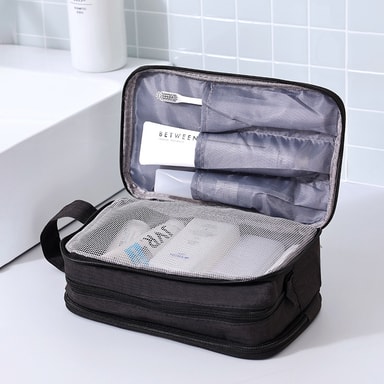 Torr och våt separationsdesign: Denna kosmetiska påse för torr och våt separation är gjord av svart Oxford-tygmaterial, och inredningen är designad med torra och våta separationsfack, som effektivt kan isolera våta kosmetika och andra föremål och undvika ömsesidig kontaminering.