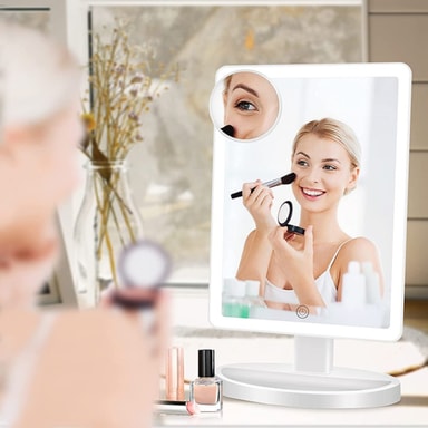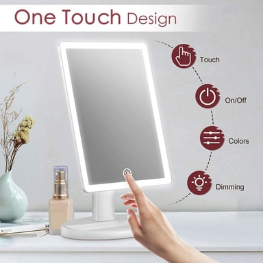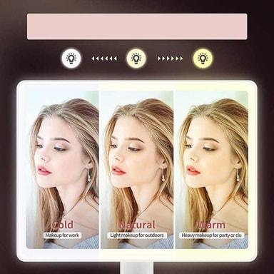 Justerbar belysning: Med tre-färgs touch-dimning låter denna LED-sminkspegel dig anpassa belysningen för att perfekt matcha din miljö och önskade utseende. Oavsett om du behöver starkt, naturligt dagsljus för exakt sminkapplikation, ett mjukt varmt sken för kvällslooks eller en sval ton för att kontrollera din hy, har denna spegel dig täckt. Justera enkelt ljusstyrkan och färgtemperaturen med en enkel beröring, vilket säkerställer optimal belysning för felfria resultat varje gång. Lämplig för olika hudtoner och sminkstilar, den justerbara belysningen minimerar skuggor och förbättrar klarheten.