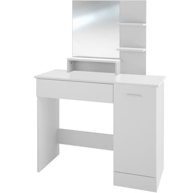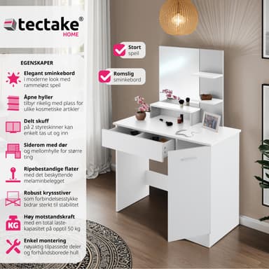 Sminkbordet Zoe från Tectake gör styling till ett rent nöje. Med den stora spegeln kan du skapa perfekta sminkningar och frisyrer. Den robusta spånskivkonstruktionen är belagd med melamin, vilket ger en reptålig och lättskött yta. Den enkla och raka designen gör att sminkbordet Zoe passar in i alla miljöer och skapar en stilren siluett i vilket rum som helst.