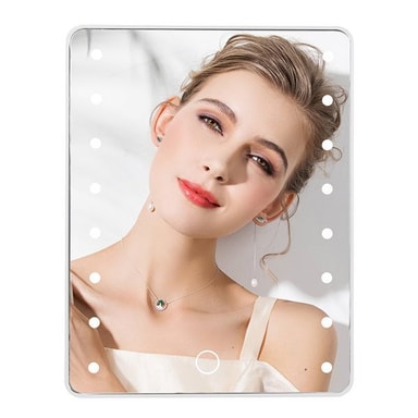 Tack vare den smarta touchsensorn kan du enkelt justera ljusstyrkan genom att hålla in cirkeln på spegeln för att anpassa ljuset efter behov och omgivning. Spegeln drivs av fyra AA-batterier (ingår ej), vilket gör den portabel och flexibel att placera var som helst utan att behöva en strömkabel.