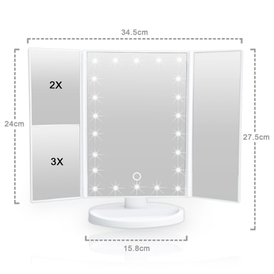 Vår kosmetikspegel är upplyst med 22 LED-lampor och har tre olika förstoringsgrader.