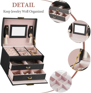 Spegel och handtag: Smyckeskrinet har ett praktiskt handtag för att lätt kunna bära det och en spegel på insidan av locket.