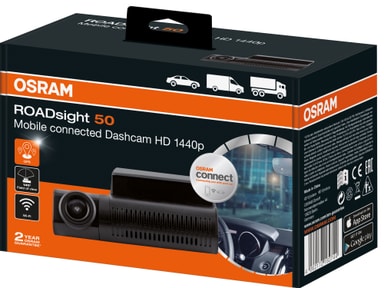 En installerad Osram RoADsight 50 Dashcam kan skapa en lugnande känsla under körning i bilen. Med en upplösning på 1440 pixlar vid 30 fps och 140 graders vidvinkelobjektiv får du högkvalitativa inspelningar, som även kan visa registreringsskyltar och vägskyltar. Tack vare WLAN-funktion och OSRAMconnect-kompatibilitet kan du enkelt få tillgång till inspelningar och bilder som du behöver i ett fall. Spela in bilposition och hastighet med GPS-funktion. Den reducerade, diskreta designen försöker inte distrahera blicken från allt: Vägen.