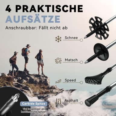 Mångsidig utomhuskompis: Dessa 5-delars pro vandringsstavar är din mångsidiga följeslagare för ett brett utbud av utomhusaktiviteter. Oavsett om du vandrar, trekkar, backpackar eller bara njuter av en lugn promenad i parken, kommer dessa stavar att förbättra din upplevelse. Den justerbara höjdfunktionen gör dem lämpliga för användare i alla storlekar, medan gummigreppet ger ett bekvämt och säkert grepp i alla väderförhållanden. De medföljande tillbehören, som lertrissor och snötrissor, gör att du kan anpassa stavarna till olika terränger och årstider. Från leriga stigar till snöiga sluttningar, kommer dessa vandringsstavar att ge dig det stöd och den stabilitet du behöver för att övervinna alla utmaningar. Investera i dessa mångsidiga vandringsstavar och lyft dina utomhusäventyr till nästa nivå. De är också kompatibla med olika utomhusutrustning och tillbehör, vilket gör dem till ett värdefullt tillskott till din vandringsutrustning.