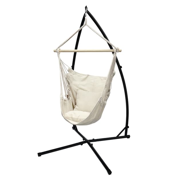 Omfattning av leverans: 1 x hängmatta stol med trästavens 2 x 40 x 35 cm kuddar 1 x rack för självmontering Beskrivning hängmatta stol I ECD Germany hängmatta stol kan du fly stressen i vardagen och njuta av ett par avkopplande stunder.