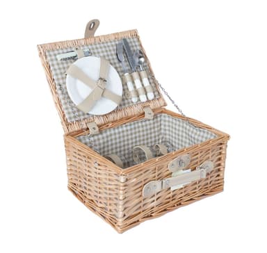 En snygg pilkorg med porslin. Den perfekta korgen för sommarpicknickar. Innehåller: *bestick: 2 set *keramiska tallrikar: 2 st *glasmuggar: 2 st *korkskruv: 1 st Tallrikar och glas tål diskmaskin.