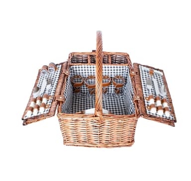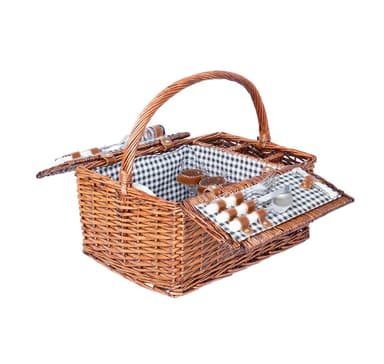 En snygg pilkorg med porslin. Den perfekta korgen för sommarpicknickar. Innehåller: *bestick: 4 set *keramiska tallrikar: 4 st *glasmuggar: 4 st *korkskruv: 1 st *salt- och pepparkar: 1 set Tallrikar och glas tål diskmaskin.