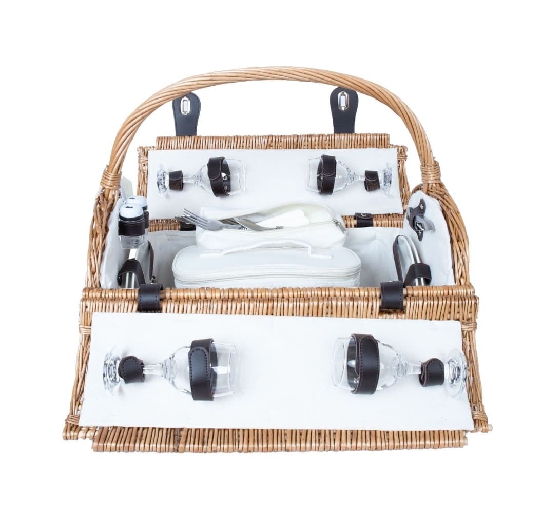 En snygg pilkorg med porslin. Den perfekta korgen för sommarpicknickar. Innehåller: *bestick: 4 set *keramiska tallrikar: 4 st *glasmuggar: 4 st *korkskruv: 1 st *salt- och pepparkar: 1 set *kylväska: 1 st Tallrikar och glas tål diskmaskin.