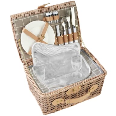 Picknickkorgen imponerar med ett 10-delars porslinsset, inklusive två tallrikar i keramik, två tåliga vinglas och bestick i rostfritt stål - allt säkert förvarat och lättillgängligt. En servitörkniv och två kryddkvarnar fulländar picknickupplevelsen och bidrar med en extra lyx. Extra praktiskt är det integrerade kylfacket som håller mat och dryck fräscha länge – perfekt för varma sommardagar i parken eller vid sjön.