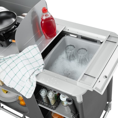 Detta campingkök blir den perfekta följeslagaren på din fritid, antingen på camping eller i ditt hem. Detta campingkök har en bänkskiva med ett praktiskt vindskydd och en diskho som kan täckas över. För god ventilation är de två rymliga förvaringsutrymmena på baksidan delvis utrustade med nät. Den robusta aluminiumramen och de höjdjusterbara fötterna på ger hög stabilitet. Nedmonterat kan detta lätta kök enkelt transporteras i den medföljande bärväskan. Detta funktionella campingkök är perfekt när du är på resande fot.