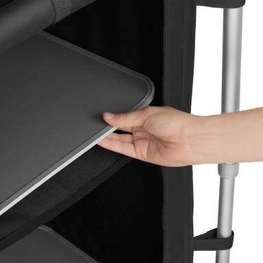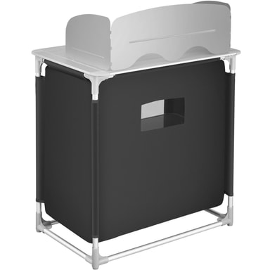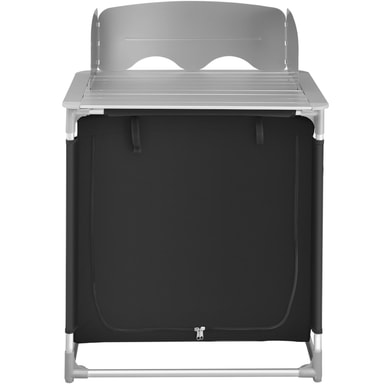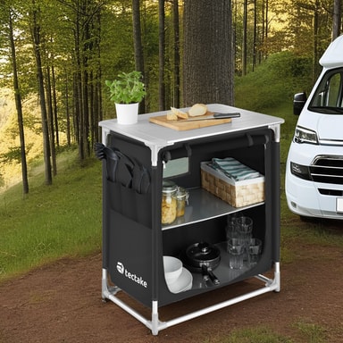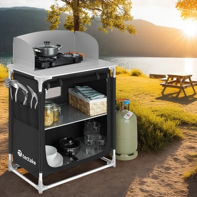 Kompakt, robust,mångsidigt: tectakes campingkök har mycket att erbjuda på ett litet utrymme. Bakom vindskyddet på den värmebeständiga bänkskivan kan du laga mat nästan som i ditt egna hem. I det stora förvaringsfacket i detta campingkök finns det två hyllor med plats för många tillbehör. Nätmaterialet på baksidan av campingköket ger en god luftcirkulation. Besticken i ytterfacken på utomhusköket är alltid nära till hands. Ojämna underlag är inget problem för kökets höjdjusterbara fötter. Med dess små dimensioner i hopfällbart tillstånd är tectakes lätta campingkök det perfekta resesällskapet på camping-resan!