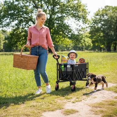 Den hopfällbara transportvagnen RollRider från tectake är det perfekta tillbehöret vid alla typer av äventyr och för alla uppgifter i vardagen. Använd produkten som trädgårdsvagn vid trädgårdsarbete, till stranden, camping eller som shoppingvagn – tack vare dess flexibla design och stora lastförmåga passar den utmärkt för olika behov.