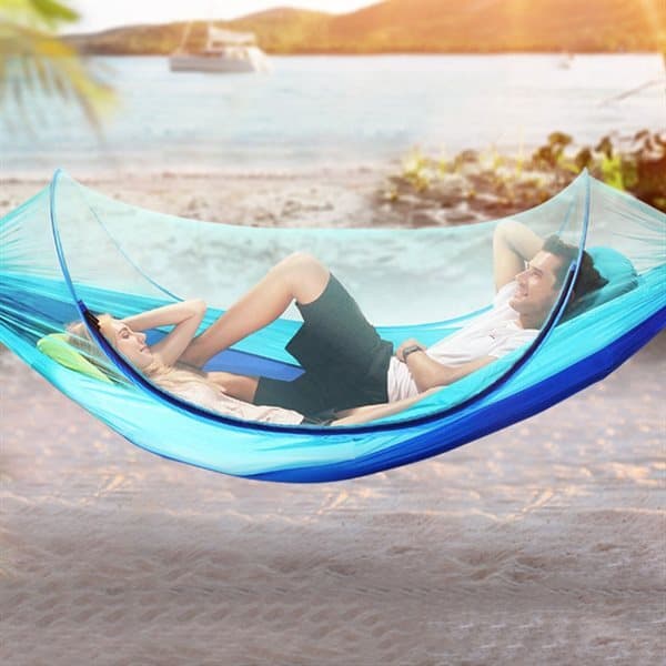 Ultratunn hängmatta medmyggnät Bekväm och lätt hängmatta med myggnät för avslappning utan besvär från insekter. - 260 x 150cm (hela hängmattan med snören/rep är 260cm) - Smart förvaringsväska - Maxvikt: 200kg