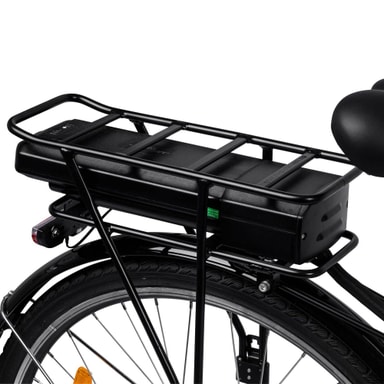 Batterikapacitet: 374 Wh ( 36V 10.4 Ah) Battericeller: 2600MAH Batterityp: Litium Räckvidd: upp till 60 km (räckvidden påverkas av assistansnivå, terräng, användarstorlek och temperatur) Batteriladdningstid: 5-6 timmar Batteri avtagbart: Ja Batteriplats: Bak Batteriladdare: 36V 2A