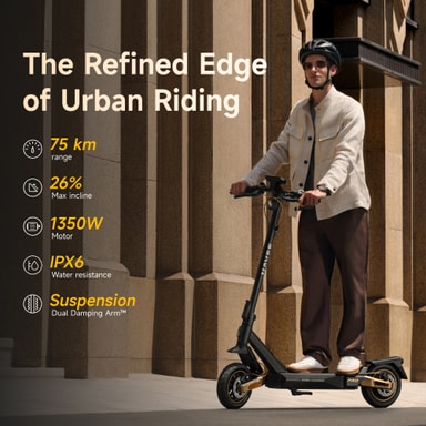 Denna sparkcykel erbjuder en betydande maximal räckvidd på 75 km, specifikt optimerad för långdistanspendling. För långdistansåkare har den ett modulärt system där ett externt batteri kan kopplas in, vilket effektivt fördubblar den totala räckvidden till imponerande 148 km.