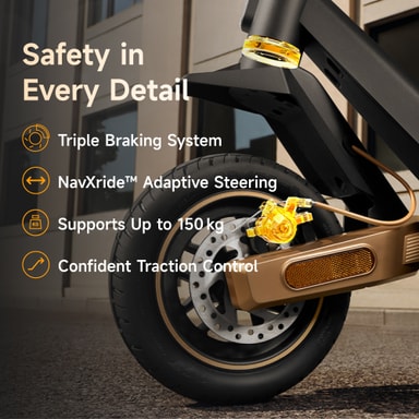 Navee ST5 Pro SE använder ett trippelbromssystem för maximal säkerhet. Det kombinerar en trumbroms fram, en skivbroms bak och ett elektroniskt E-ABS-system för att säkerställa korta, stabila bromssträckor och förhindra hjullåsning, även på hala underlag.