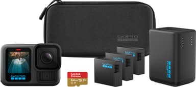 GoPro HERO13 Black actionkamerapaket erbjuder 5.3K video, HB-seriens objektiv, HyperSmooth 6.0-stabilisering, 360° horisontlås och flexibla monteringsmöjligheter. Inkluderar 3 Enduro-batterier.Läs mer om produkten