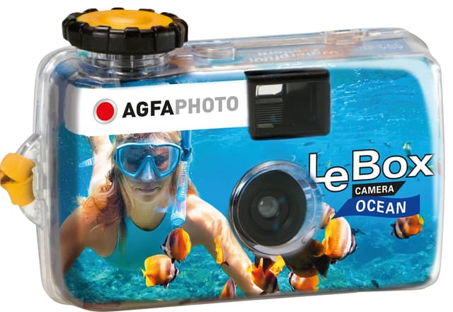 Gör dina minnen från stranden och undervattenäventyr till färggranna bilder med Agfaphoto LeBox Ocean analog engångskamera. Tack vare dess vattentåliga design kan ta du undervattensbilder enkelt. Kameran är laddad med en ISO 400 negativ färgfilm och har en kapacitet för 27 exponeringar.