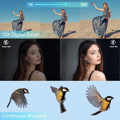 16× digital zoom och autofokus: Med upp till 16× digital zoom kan du fånga avlägsna motiv med bibehållen skärpa. Utforska kreativ fotografering med 20 inbyggda filtereffekter – från solnedgångstoner och strandscener till klassisk svartvitt – allt med ett knapptryck. Ytterligare funktioner som ett-trycks skönhetsläge, leendedetektering, ansiktsigenkänning, time-lapse-inspelning och självutlösare uppfyller alla dina inspelningsbehov.