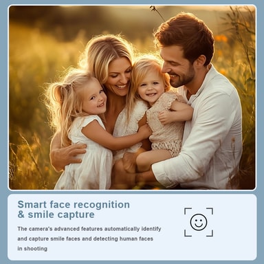 Smart ansiktsigenkänning och smile capture: Kamerans avancerade funktioner identifierar och fångar automatiskt leende ansikten och upptäcker mänskliga ansikten vid fotografering, vilket säkerställer att du aldrig missar en glad stund. Kameran erbjuder även skönhetsfilter, anti-shake-funktion med mera.