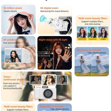 Högkvalitativ bildåtergivning: Fånga fantastiska foton och videor med det högupplösta dubbla linssystemet, vilket säkerställer exceptionell klarhet och detaljrikedom i varje bild. Kameran stöder flera bildupplösningar, inklusive 1M (1280x960), 2M (1440x1080) och 3M (1920x1440), vilket gör att du kan välja den perfekta inställningen för dina behov. Perfekt för att fånga minnen med livfulla färger och skarpt fokus, denna digitalkamera är perfekt för både amatörer och entusiaster som letar efter en kompakt och mångsidig enhet. De högupplösta funktionerna gör den lämplig för utskrift, delning online och bevarande av värdefulla ögonblick med enastående bildkvalitet.
