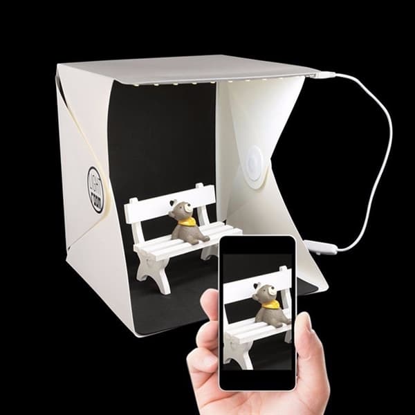 Ligth Room / Ligth in box - Foto Ljustält med belysning & Bakgrunder Ta fina bilder utan störningsmoment och med bra belysning i din egen fotostudio. Perfekt för dig som älskar att lägga upp stilrena bilder på sociala medier som blogg eller instagram. Belysningen skapar en ljus miljö i boxen vilket ger en skarp bild. Storlek ca: 240 * 220 * 220 mm Ljus temperatur: 6400 K Kitet Inkluderar: - studio - 2 st bakgrunder svart / vit - Förvaringspåse - Laddningskabel