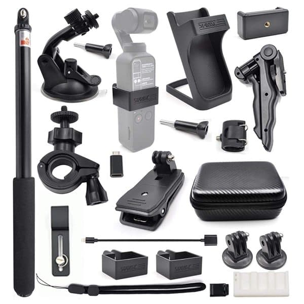 Tillbehörskit med 21 delar till DJI OSMO Pocket. Justerbar stång med en max längd på 94cm. Telefonhållaren är tillverkad av ABS-material och har en maximal utdragbar längd på 85mm. Den är lämplig för både mobiltelefoner eller plattor. Innehåller Sugkopp till bil, cykelhållare, ABS-stativ, skrivbordshållare, ryggsäcksklämma, selfie-pinne med Lightning kabel och micro-USB adapter, förvaringsväska, dammskydd, adapter och förvaringsbox
