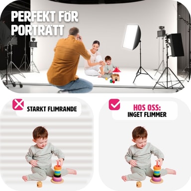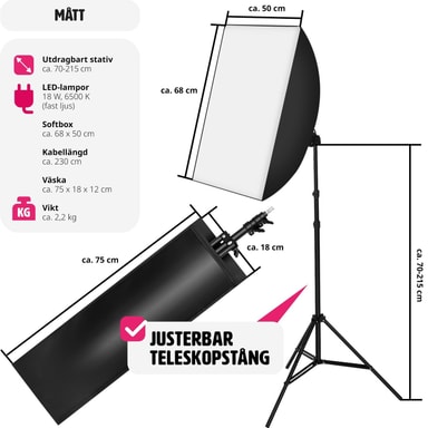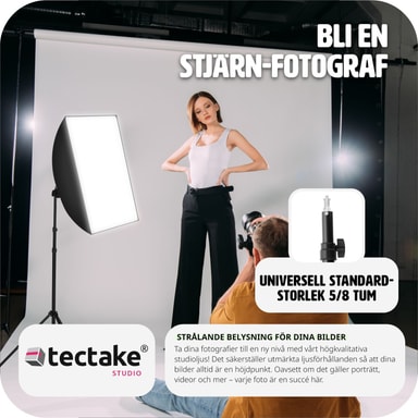 Denna studiolampa med utrustning inkl. stativ, softbox och väska, hjälper dig att ta dina foto-drömmar till en helt ny nivå. Oavsett om du är hobbyfotograf eller proffs, vill du naturligtvis alltid ta bra bilder. Med vår studiolampas belysning kan du utan större förkunskaper ta kvalitetsbilder! Visa upp dina foton från studion i bra ljus med denna studiolampa med stativ!