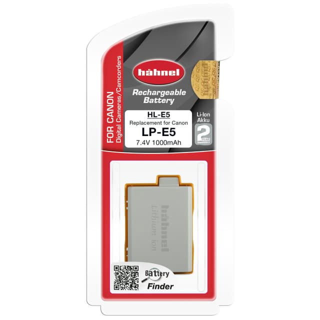 Detta Hähnel HL-E5 Li-ion kamerabatteri kan användas som en ersättare för Canons LP-E5 batteri till Canons digitala kameror och videokameror. Batterikapaciteten är på 1000 mAh vid 7,4 V spänning.