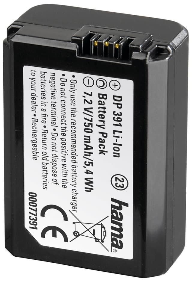 Hama DP-391 Li-ion kamerabatteri kompatibel med Sony NP-FW50 batteri för Sony DSLR-kameror. Batteriet har en kapacitet på 750 mAh på 7.2 V och Safety-elektronik och Polyswitch-stopp för att förhindra skador på battericeller kortslutning och överhettning. Guldpläterade kontakter hindrar glapp och oxidation. Batteriet har fem års garanti.