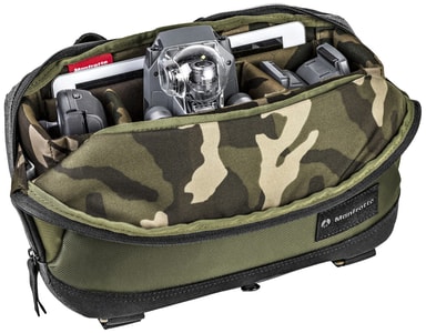 Förvara din kamera, tillbehör och andra prylar säkert från både stöld och skador i Manfrotto Street kamera sling/midjeväska. Det vadderade huvudfacket rymmer en premium kompakt systemkamera eller ingångnivå DSLR-kamera med standard zoomobjektiv fäst på kameran, och ytterligare två objektiv (beroende på storlek). Du kan också välja att lämna kameran hemma och ta med dig ditt DJI Mavic Pro Combo-paket istället. Huvudfacket kan delas in i flera sektioner med de medföljande delarna.