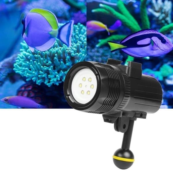 Undervattenslampa led gopro hero7 /6 /5 1500 lumens 60m lampa med starkt ljus 1500lm/6 lysdioder cree xm-l r3. Robust och hållbar, 60m vattenbeständig, testad driftsfrekvens till 5000 gånger. 6500k färgtemperatur, livslängd på ca50000 timmar. Obs! Se inte direkt på ljuset, det kan skada din syn.