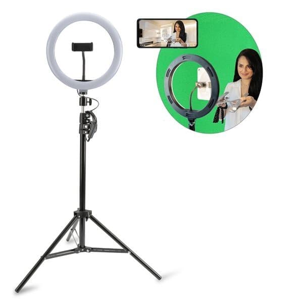 LED-ring med stativ & Green Screen Sätt dig själv i rampljuset under dina videosändningar: 4smarts LoomiPod med sina tre exponeringsalternativ, två stativ i olika höjder och den extra gröna skärmen låter dig se perfekt ut med varje livestream, YouTube-film, TikTok-video eller foto. Lys upp dina videor och foton optimalt och placera din smartphone i den perfekta positionen för att filma. De två olika stativen och LED-ljuset lyser upp varje scen perfekt . De två stativen ser till att du alltid kan placera smarttelefonen i den optimala vinkeln för din video. Använd det större stativet för att skapa stående bilder eller det mindre på borden för att få den perfekta bilden när du sitter. De tre olika, dimbara ljuslägena belyser varje bild optimalt. De solida stativen låter dig placera hållaren säkert på vilken yta som helst och förhindrar fula vinglar eller vibrationer under din livestream. Förbättra dina videor ännu mer med den medföljande gröna skärmen. Med hjälp av detta tillägg kan du göra din bakgrund enklare och som du vill. Passa in i actionfyllda spelscener eller välj en vacker bakgrund som en strand eller landmärken. Du bestämmer efter situation och behov. Mobilklämman passar ett stort antal smartphones och ser till att din enhet är i exakt position. Det spelar ingen roll om du tar bilder eller filmar i stående eller liggande format. Dessa stativ är lösningen för alla livesändningar, show, instruktionsvideor och foton för sociala medier. Ha alltid Loomipoden med dig. Den praktiska bärväskan låter dig ta med dig LED-ringen och stativ vart du än går. Tre ljusfärger: varmt gult ljus, varmt vitt ljus, vitt ljus Dimbart ljus: 10 ljusnivåer per ljusfärg Maximal höjd på stort stativ: 173 cm Maximal höjd på litet stativ: 35 cm LED-ringdiameter: 26 cm 180° justerbar LED-belysningsring Individuellt justerbar hållarklämma för smartphonen Praktisk bärväska av tyg för bekväm förvaring av stativ och LED-lampan Strömförsörjning via USB-A-kabel Ineffekt: 5V/2A Ljusflöde: 200 lm Färgtemperatur: 2800 - 7200K Färgåtergivningsindex (CRI): 85 Ra Kabellängd: 2m Green Screen mått: 2x3m