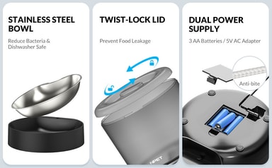 Dubbla strömlägen: Använd mataren med antingen den medföljande USB-datakabeln eller tre 5:e batterier (ingår ej). De dubbla strömlägena säkerställer att ditt husdjurs matningsschema förblir oavbrutet, även i händelse av strömavbrott.