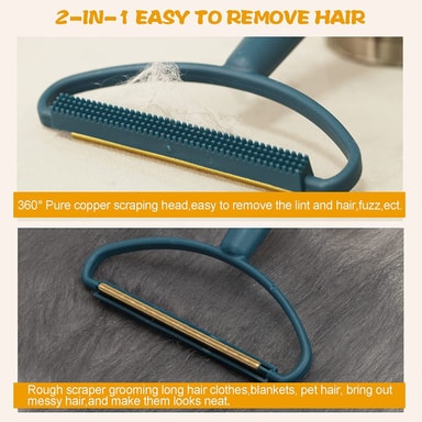 Dubbelsidig: Den ena sidan är av ren koppar och kan snabbt ta bort päls, ludd och hår. Den andra sidan med runda borsthuvuden jämnar ut textilytan.