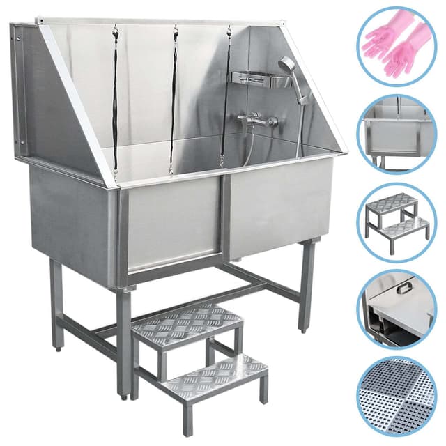 Djurbadkaret kommer med en stege för mindre djur eller de som behöver extra hjälp att komma upp och är tillverkat av rostfritt stål. Badkaret är ämnat för djursjukhus, kennlar och andra djurindustrier för mellanstora djur och har en halkfri matta och 3 koppel.