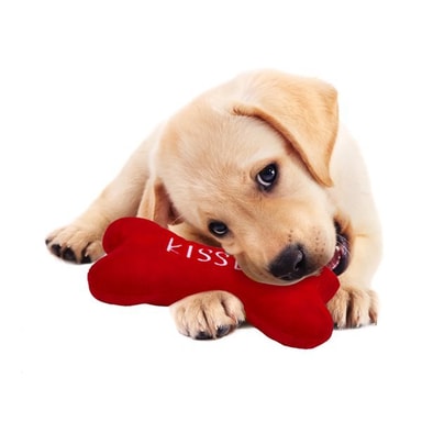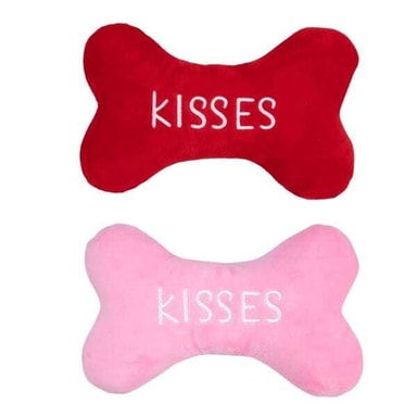 Rosa och röd hundleksak liknande ett ben med stimulerande pipljud. Prydd med texten ""Kisses"", en pipleksak som dessutom kan hjälpa till att minska stress och tristess genom att ge din hund en uppgift att fokusera på. Köp en idag och se själv hur din hund blir besatt av det pipande ljudet!